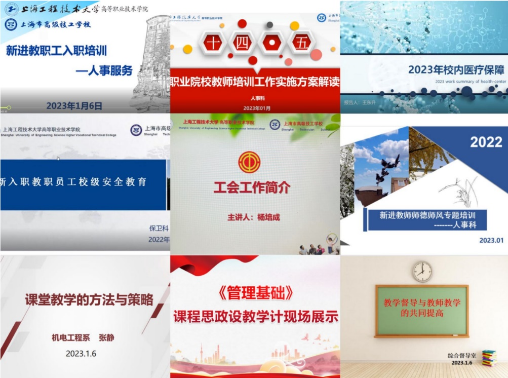 制度政策方面,人事科科长林春、副科长许力以及罗云老师分别围绕薪酬管理、考勤、培训及专业技术职务评定等人事制度、“十四五”职业院校教师培训工作实施方案、教师教育培训数据更新等进行了具体讲解,内容主要涵盖了与教职工切身利益相关的人事各方面制度和要求;卫生所所长王东升、保卫科副科长金坚、工会副主席杨培成结合自身工作,就校园服务方面展开介绍,内容主要涵盖了校内医疗保障、安全知识教育、工会服务内容等。机电工程系张静老师围绕课堂教学的方法与策略,为大家分享了许多实实在在的教学经验,让新进教师对课前准备、课中教学和课后反思的整个教学过程有新的认识。管理系主任袁建昌结合自己的教学思政实践经验,以丰富的案例向老师们展示了如何有效完成课程中思政教学。在教学能力综合实践方面,综合督导办公室副主任张霓结合督导日常工作,对教师提出了教学建议,指出如何互相学习、共同提高。