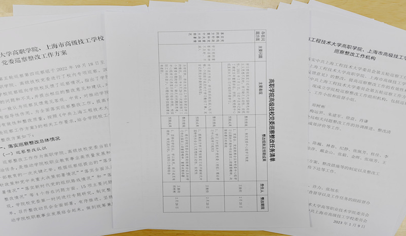 1月4日,上海工程技术大学党委第四巡察组巡察高等职业技术学院党委、上海市高级技工学校党委情况巡察反馈会召开以来,高职学院、高级技校党委自觉从政治和全局的高度认识和看待巡察整改工作,切实承担巡察整改主体责任,把巡察整改作为严明纪律、加强管理、深化改革、推动发展的良机,积极有效地完善压力传导的新举措,激发教育发展的新动力,营造党内生活的新常态。