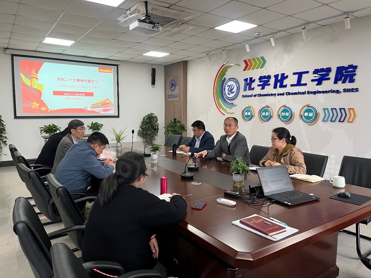 4月25日下午,化学化工学院党委理论学习中心组专题学习党的二十大精神与《习近平新时代中国特色社会主义思想的世界观和方法论摘编》,学院领导班子全体成员参加学习。