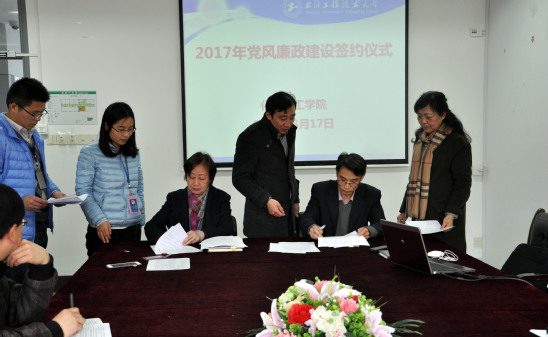 随后,学院副院长、系主任、实验室主任、办公室主任、党支部书记、工会主席等分别与院长饶品华、党总支书记刘宇虹签署了《2017年党风廉政建设责任书》。