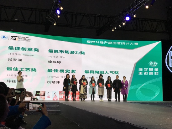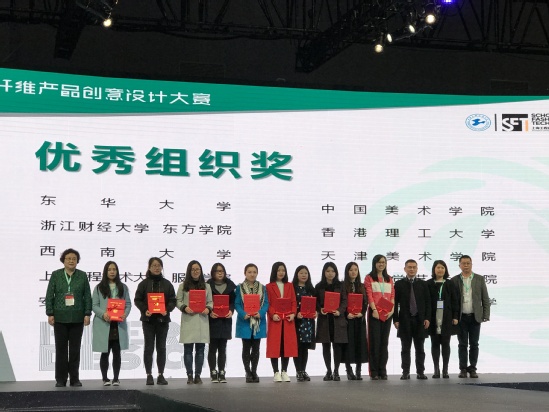 3月16日,由中国化学纤维工业协会•绿宇基金主办的绿宇基金-走进高校“绿色纤维产品创意设计”大赛在上海市国家会展中心举行颁奖典礼。来自上海工程技术大学服装学院的研究生骆邓玉(作品名:花•舞)和沈淑仪(作品名:沼泽)获得了大赛的银奖,龚昀(作品名:大漠孤烟)和龚柏慧(作品名:棽)获得了大赛的铜奖,徐蓉蓉老师获得了优秀指导老师奖。校服装学院党委书记袁蓉、副书记李扬受邀出席了此次颁奖典礼。