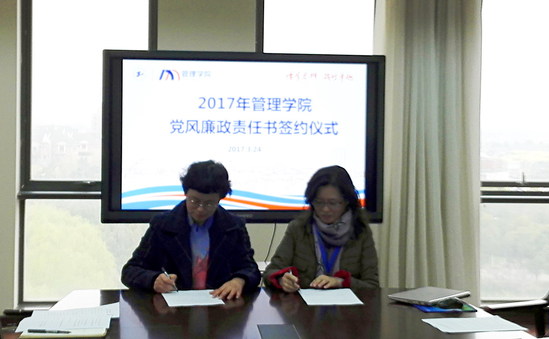 随后,学院副书记、副院长、系主任、实验室主任、办公室主任、党支部书记、工会主席等分别与党委书记周洁老师签订了《2017年管理学院党风廉政建设责任书》。