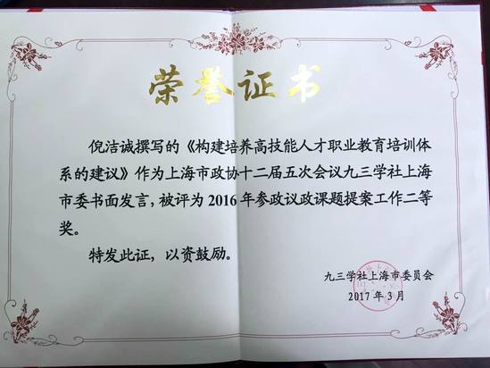 4月7日,九三学社上海市委2017年度参政议政工作暨表彰会在民主党派大厦六楼多功能厅(陕西北路128号)召开。服装学院倪洁诚教师撰写的《构建培养高技能人才职业教育培训体系的建议》作为上海市政协十二届五次会议九三学社上海市委书面发言,被评为2016年参政议政课题提案工作二等奖。