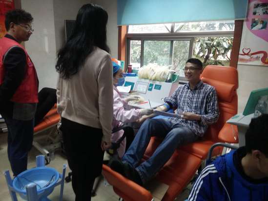一腔青春的热血,一颗爱心的关怀,每个人平静又不平静的内心,将整个献血活动推向了高潮,每一位无偿献血的同学心中只有欣慰与自豪。献血过程中发生了多起感人至深的事迹,其中学院的学生会主席宋华伟献血要求极其强烈,进行了六次血压测量才符合标准后终于心满意足地完成了献血。献血完毕后,同学们被告知献血之后的注意事项,并转移到休息厅休息。上海工程技术大学副校长鲁嘉华,航空运输学院、飞行学院院长何法江,党总支书记虞蓉来到献血现场与同学们亲切交流,询问献血感受,嘱托献血之后要好好休息,合理规划之后的生活方式。