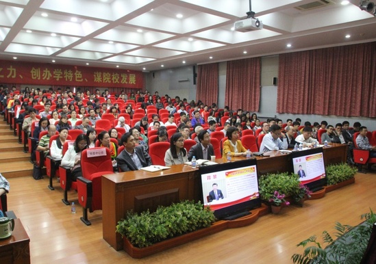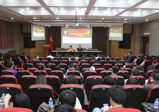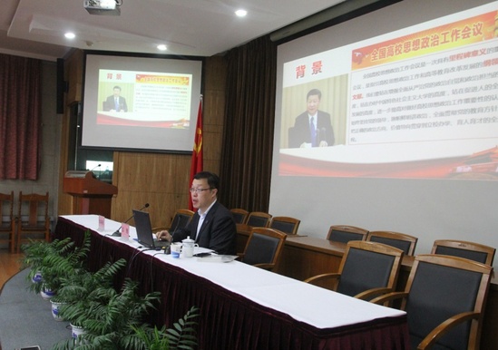 4月21日下午,校党委讲师团成员、校党委宣传部部长兼党办主任王陈同志来到高职学院综合楼思进厅作《学习贯彻落实全国高校思想政治工作会议精神》专题辅导报告。高职学院党委中心组成员,全体中层干部、教工和学生党员,第六十七期党校学员共二百三十余人参加了会议,会议由学院党委书记沈海庆主持。