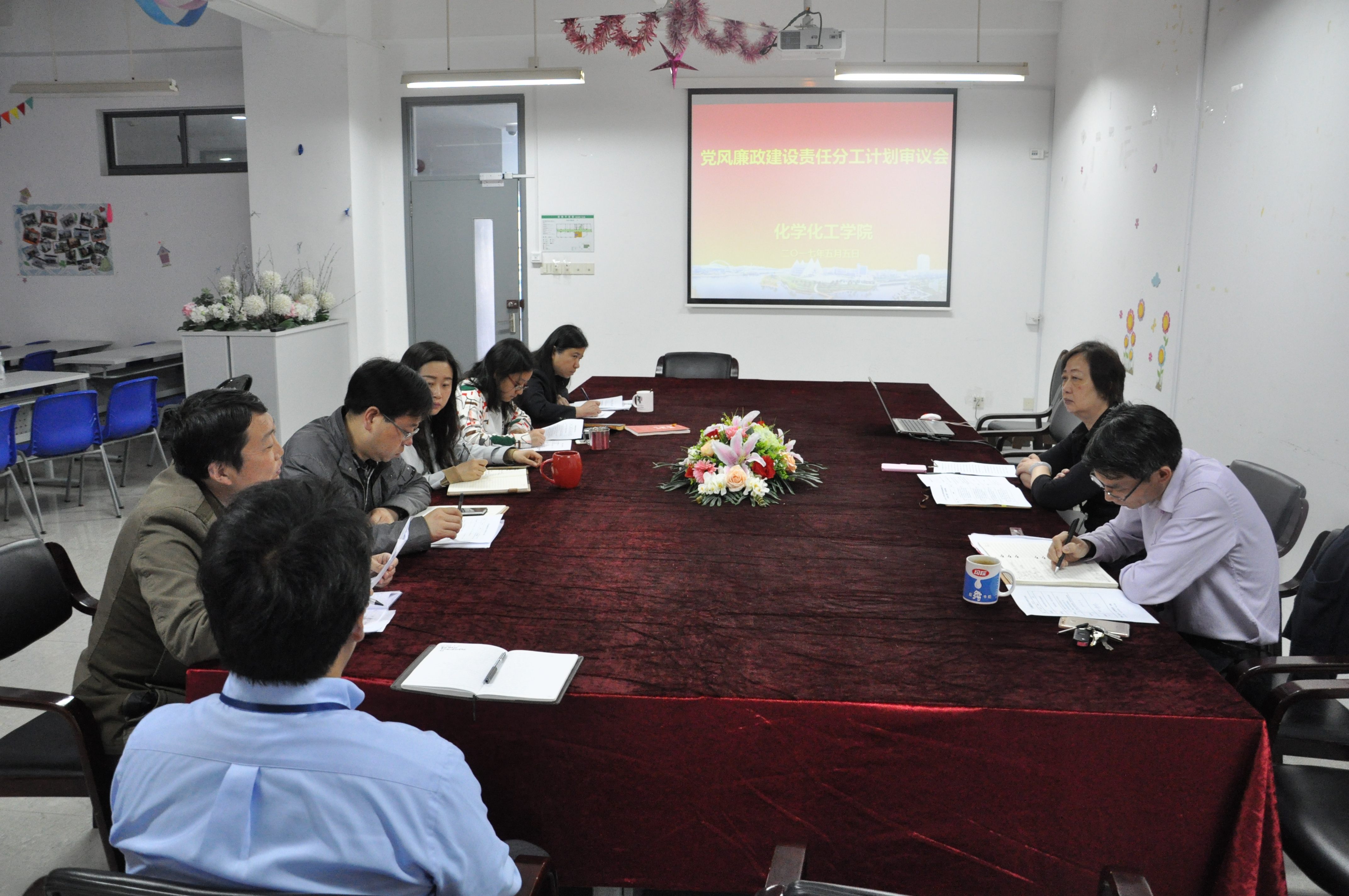 5月5日上午,化学化工学院在实训楼4405召开2017年度二级学院党风廉政建设责任分工计划审议会。会议由刘宇虹书记主持,参加会议的是学院全体党政班子领导成员。