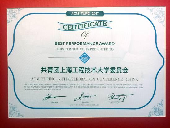 5月12日至14日,ACM图灵奖五十年中国大会在上海隆重召开,此次盛会由上海市人民政府、公安部第三研究所等联合主办,来自全世界计算机及互联网领域的权威专家、历届图灵奖获得者、世界级企业家、中国工程院及清华大学等校研究专家参加。校团委艺术团受大会主席团邀请,参加盛会的现场表演,受到了包括美国工程院院士、谷歌公司副总裁、“互联网之父”温顿•瑟夫博士,世界著名华人企业家李开复博士等与会嘉宾的高度赞赏,获颁大会最佳表演奖殊荣。