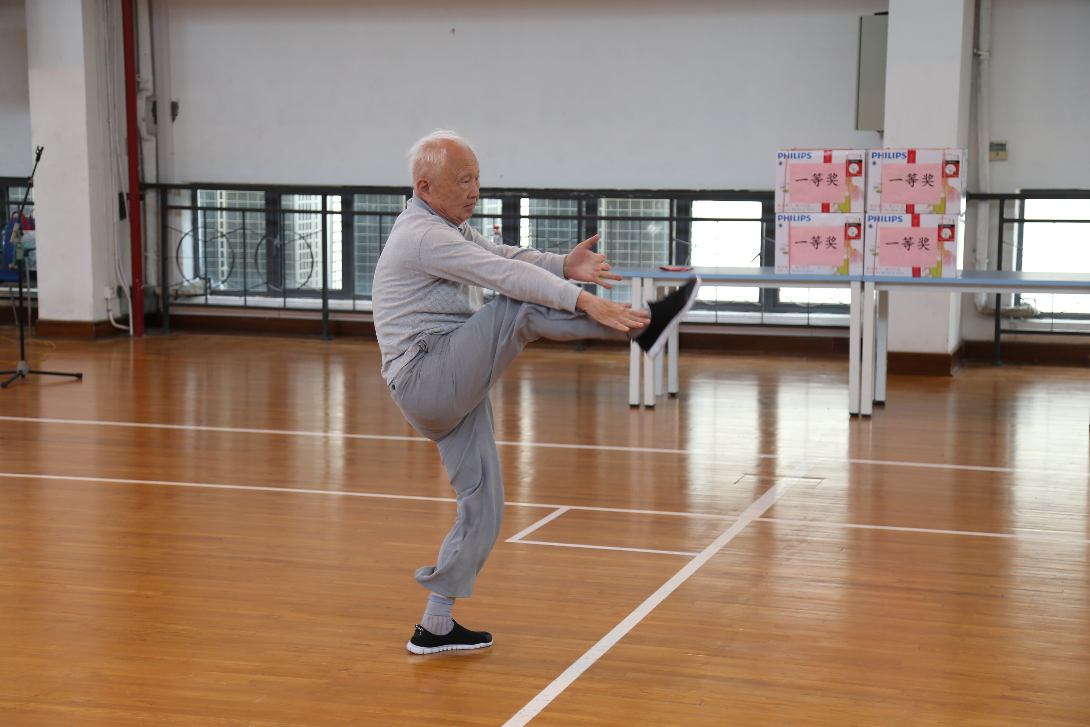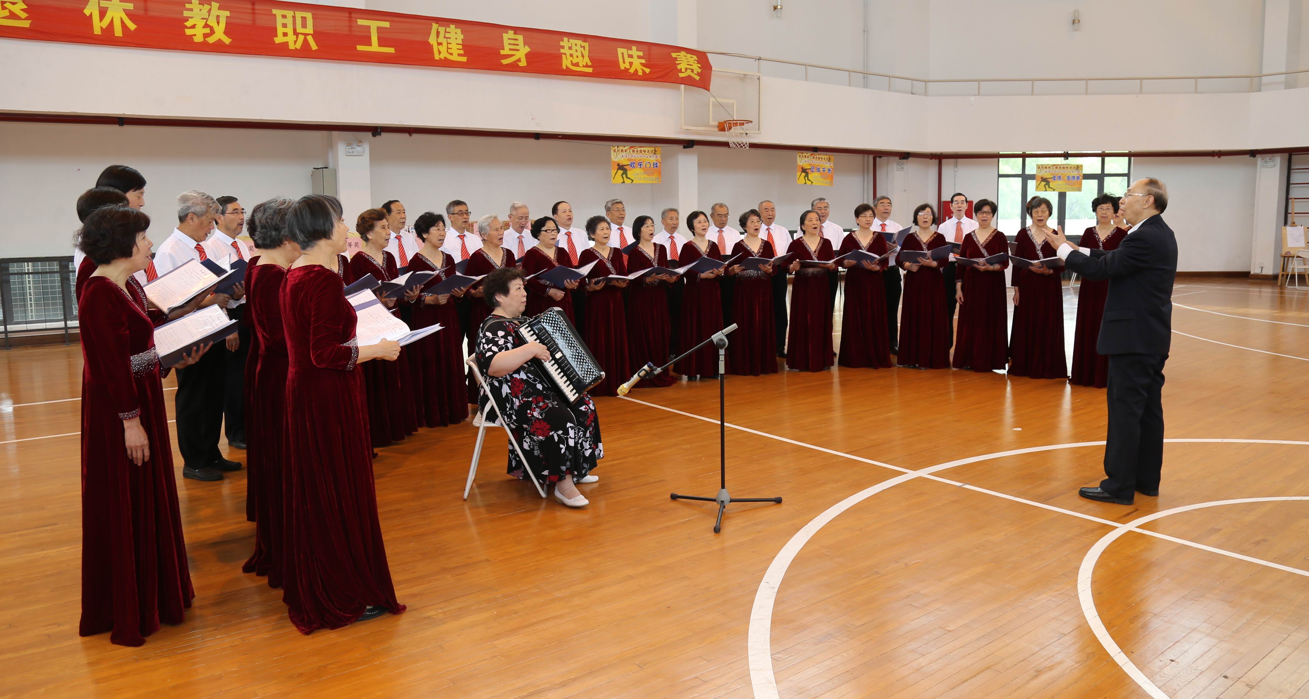 健身趣味赛开幕式伊始,校老教师合唱团满怀激情地演唱了《红旗颂》、《我和我的祖国》;退休教职工健舞队神采奕奕地展示了舞蹈《春江花月夜》;退休教师赵卫东教授满怀深情地朗诵了《我的祖国》;年逾八旬的老教师杨建明表演了生龙活虎的武术。他们精彩的表演,充分展现了老同志们绚丽多彩的退休生活和良好的精神风貌,赢得了全场阵阵热烈的掌声。