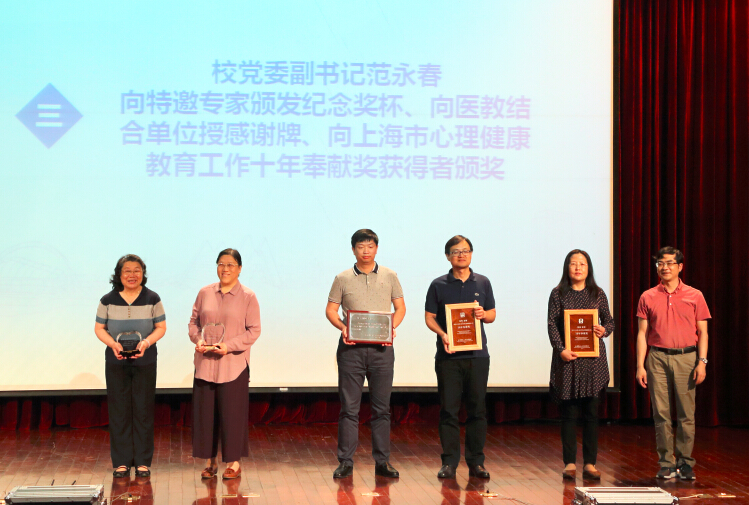 大会在纪念视频《流光溯影》中拉开了帷幕,校党委副书记范永春向特邀专家代表颁发纪念奖杯、向医教结合单位松江区精神卫生中心授予感谢牌、向2016年上海市心理健康教育工作十年奉献奖获得者颁发了奖牌。
