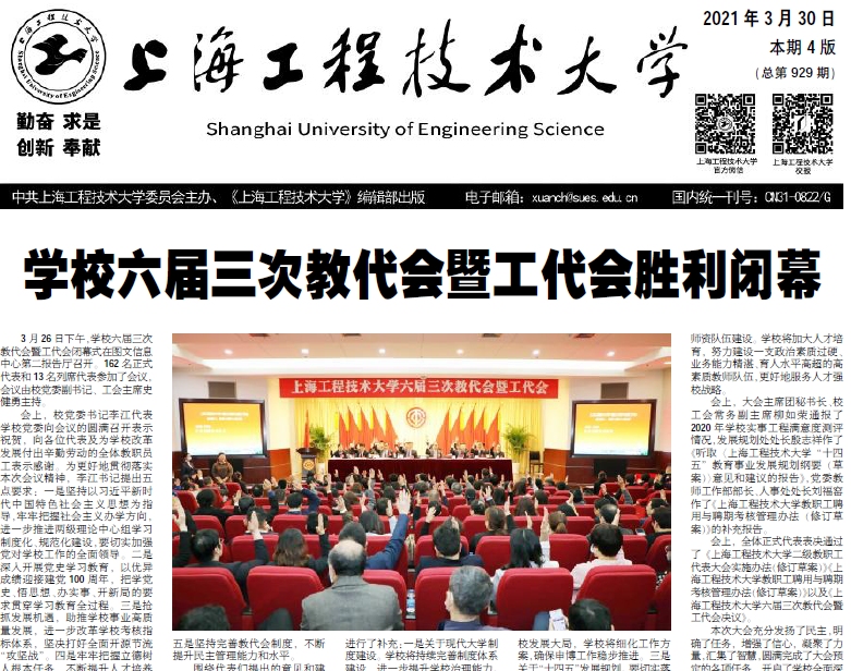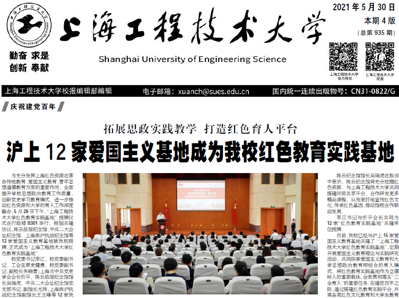 5月30日.pdf第一版【庆祝建党百年】拓展思政实践教学打造红色育人平台沪上12家爱国主义基地成为我校红色教育实践基地为充分发挥上海红色资源在革命传统教育、爱国主义教育、青年思想道德教育方面的重要作用,全面提升学校思想政治教育工作质量,创新党史学习教育模式,进一步推动红色资源和大学的育人工作深度融合,5月28日下午,“上海工程技术大学红色教育实践基地”授牌仪式在行政楼B301举行,根据共建协议,陈云故居纪念馆、中共二大会址纪念馆、上海淞沪抗战纪念馆等12家爱国主义教育基地被我校授牌,正式成为“上海工程技术大学红色教育实践基地”。校党委书记李江,校党委副书记、工会主席史健勇,校党委副书记、副校长朱晓青;上海市中共党史学会会长忻平,陈云故居纪念馆馆长吴瑞虎,中共二大会址纪念馆党支部书记、副馆长尤玮,上海淞沪抗战纪念馆副馆长王玉峰等12家我校红色教育实践基地共建单位的代表出席活动。授牌仪式上,李江书记指出,在全国上下喜迎中国共产党成立100周年、深入开展党史学习教育之际,上海工程技术大学与陈云纪念馆等单位共建红色教育实践基地并进行授牌,这是我校深化思政实践教学、强化师生党史学习教育和爱国主义