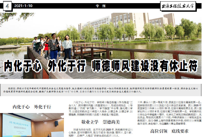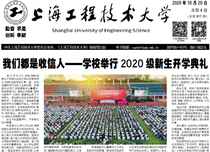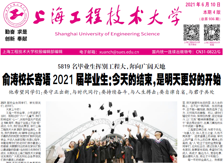 6月10日.pdf第一版5819名毕业生挥别工程大,奔向广阔天地俞涛校长寄语2021届毕业生:今天的结束,是明天更好的开始他希望同学们:要守正出新,与时代同行;要持续奋斗,与人生搏击;要自律自省,与君子共处2021届毕业生同学们、家长朋友们,老师们:大家上午好!又是一年毕业季,少年追梦正当时。刚刚过好“六一”儿童节,我们即将迎来“七一”,庆祝中国共产党成立100周年。得益于全国上下战“疫”成功,今天,我们在此聚首,举行上海工程技术大学2021届毕业典礼。首先,我代表学校,向5819名毕业生表示最热烈的祝贺!祝贺你们顺利完成学业,开启人生新征程!向悉心指导、辛勤培育你们的老师们表示最衷心的感谢,向默默付出的亲友家长们致以最诚挚的敬意!也向倾力支持你们成长、长期关注上海工程技术大学建设发展的广大校友和社会各界朋友们表示最衷心的感谢!2021年即将翻开历史重要的一页,站在“两个一百年”的历史交汇点,生逢其时,你们何其有幸;重任在肩,你们未来可期;你们秉承工程大“勤奋、求是、创新、奉献”的校训精神,只争朝夕乘风破浪,不负韶华奋楫前行。在你们当中,有很多闪亮的名字。机械与汽车工程学院陈白强同学,