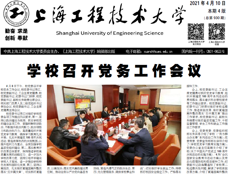 4月10日.pdf第一版学校召开党务工作会议4月8日下午,校党委召开学校党务工作会议,校党委书记李江,校党委副书记、工会主席史健勇,校党委副书记、纪委书记门妍萍,校党委副书记、副校长朱晓青出席会议,相关部门负责人及二级党组织书记参加会议。校党委副书记、工会主席史健勇主持会议。校党委书记李江对做好学校党委各项工作提出四点要求:第一,坚持以政治建设为统领,抓实学校党的建设各项工作。要旗帜鲜明讲政治,不断提升政治判断力、政治领悟力和政治执行力;高质量组织开展党史学习教育,确保学习教育扎实开展;扎实开展建党100周年庆祝活动,营造浓厚热烈的庆祝氛围;以提升组织力为重点,全面加强学校基层党组织建设。第二,落实教育评价改革总体要求,保持推进学校高质量发展的战略定力。进一步加大学校改革力度,坚持引培并举建设学校人才高地,进一步推动学校特色发展和国际化发展。第三,坚持以案促改,扎实做好夏建国案件整改落实“后半篇文章”。切实抓好夏建国案件整改落实工作,做实以案促改,以案促治;落实党风廉政建设责任制,推动全面从严治党向基层有效延伸;坚决筑牢拒腐防变的思想防线,营造风清气正的政治生态。第四,优化管理服务,确