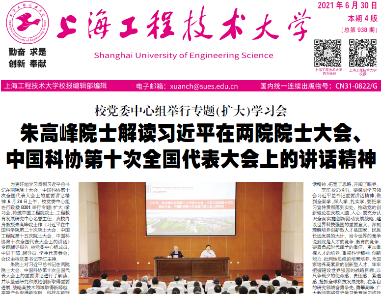 6月30日.pdf第一版校党委中心组举行专题(扩大)学习会朱高峰院士解读习近平在两院院士大会、中国科协第十次全国代表大会上的讲话精神为更好地学习贯彻习近平总书记在两院院士大会、中国科协第十次全国代表大会上的重要讲话精神,6月24日上午,校党委中心组在行政楼B301举行专题(扩大)学习会,特邀中国工程院院士、工程教育发展研究中心名誉主任、我校终身教授朱高峰院士作《习近平在中国科学院第二十次院士大会、中国工程院第十五次院士大会、中国科协第十次全国代表大会上的讲话》专题辅导报告。校党委中心组成员,中层干部、辅导员、学生代表参会,会议由校党委书记李江主持。朱院士对习近平总书记在两院院士大会、中国科协第十次全国代表大会上的重要讲话进行了解读,并从基础研究和原始创新取得重要进展、战略高技术领域取得新跨越、高端产业取得新突破、科技在新冠肺炎疫情防控中发挥了重要作用、民生科技领域取得显著成效、国防科技创新取得重大成就等六方面总结了我国科技事业取得的新的历史性成就。分析了新一轮科技革命和产业变革的演化趋势,从加强原创性、引领性科技攻关,坚决打赢关键核心技术攻坚战;强化国家战略科技力量,提升国家创新体系整