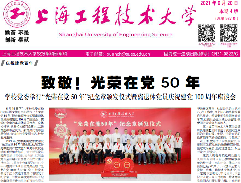 6月20日.pdf第一版【庆祝建党百年】致敬!光荣在党50年学校党委举行“光荣在党50年”纪念章颁发仪式暨离退休党员庆祝建党100周年座谈会6月15日下午,学校党委在松江校区图文信息中心举行“光荣在党50年”纪念章颁发仪式暨离退休党员庆祝建党100周年座谈会。获颁纪念章的离退休党员代表,全体校领导、党务相关部门负责人、二级党组织书记代表、新党员代表等出席会议。会议由校党委副书记、校长俞涛主持。2021年,党中央决定首次颁发“光荣在党50年”纪念章,这项工作是中国共产党成立100周年庆祝活动的重要组成部分,对于增强党员的荣誉感、归属感、使命感,汇聚全党为全面建设社会主义现代化国家持续奋斗,具有十分重要的意义。今年我校共有178名老党员获颁“光荣在党50年”纪念章。会上,校党委书记李江为离退休党员代表颁发了纪念章,并代表学校党委向所有纪念章获得者表示热烈的祝贺和崇高的敬意。李江书记指出,我们现在处于百年未有之大变局,要充分认识党中央在建党百年之际,在实施“十四五”规划、全面建设社会主义现代化国家新征程的开局之年,首次颁发“光荣在党50年”纪念章的重大历史意义,以此汲取力量,激发赓续奋斗的精