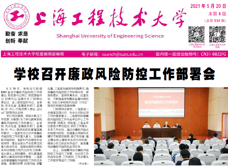 5月20日.pdf第一版学校召开廉政风险防控工作部署会5月19日,学校在行政楼B301室召开廉政风险防控工作部署会,校党委书记李江,校党委副书记、纪委书记(监察专员)门妍萍出席会议,各二级党组织书记、各学院、机关处室、直属服务部门、直属院(所、中心)行政负责人参会,会议由门妍萍同志主持。李江同志强调,根据市教卫工作党委、市教委《关于深化教育系统廉政风险防控工作的意见》,各学院、机关处室、直属服务部门、直属院(所、中心)要深刻汲取夏建国案件教训,一是要充分认识开展廉政风险防控工作的重大意义。加强廉政风险防控,是新时代加强党的全面领导、落实全面从严治党责任的重大政治任务,是推动高校治理体系和治理能力现代化的有力保障,是从源头上预防腐败,深化夏建国案件以案促改的根本需要。二是要全面掌握廉政风险防控工作的任务措施。要清权明责、找准风险、预警处置。三是要加强领导明确责任,确保廉政风险防控工作取得实效。要狠抓落实,坚持求真务实,注重实效,不断提高学校整体监督治理效能,为助力学校顺利完成十四五规划目标提供坚强保障!门妍萍同志要求:一是要进一步提高思想认识,充分认识到此项工作的重要意义;二是要把加强廉