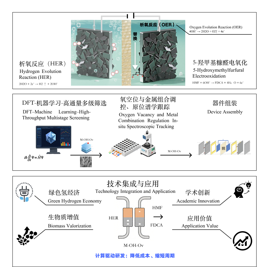 发展低能耗电解水制氢与生物质高值化集成技术对实现“双碳”目标具有重要意义。本研究通过耦合碱性析氢反应(阴极)与5-羟甲基糠醛(HMF)电氧化制2,5-呋喃二甲酸(FDCA)(阳极),构建低能耗制氢-生物质增值协同体系。针对现有电极材料成本高、双功能活性不足等瓶颈,本项目提出“计算-实验”协同策略:通过DFT初筛结合机器学习预测和高通量验证的三级策略,构建氧空位修饰的非贵金属层状氢氧化物(M-OH-Ov),系统解析金属组分与氧空位浓度对活性位点几何/电子结构的调控规律;结合原位表征与微动力学模拟,阐明阳极羧基形成与阴极O-H键活化的原子级演变机制,建立结构参数(价电子数等)与催化性能(活性、选择性等)的定量构效关系。在此基础上开发双功能电极,集成电解水-生物质转化。项目通过计算驱动高效筛选突破传统试错法局限,降低研发成本,为绿氢经济与生物质资源利用提供自主核心技术,兼具学术创新性与应用价值。