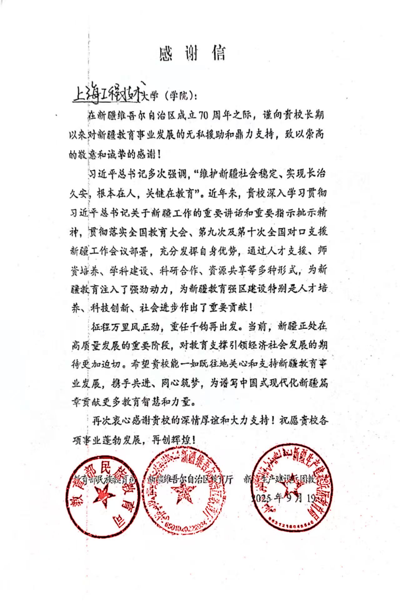 在新疆维吾尔自治区成立70周年之际,学校喜获教育部民族教育司、新疆维吾尔自治区教育厅及新疆生产建设兵团教育局联合发来的感谢信,对我校长期以来在对口支援新疆教育事业中所作出的积极贡献表示高度认可,并致以崇高的敬意和诚挚的感谢。