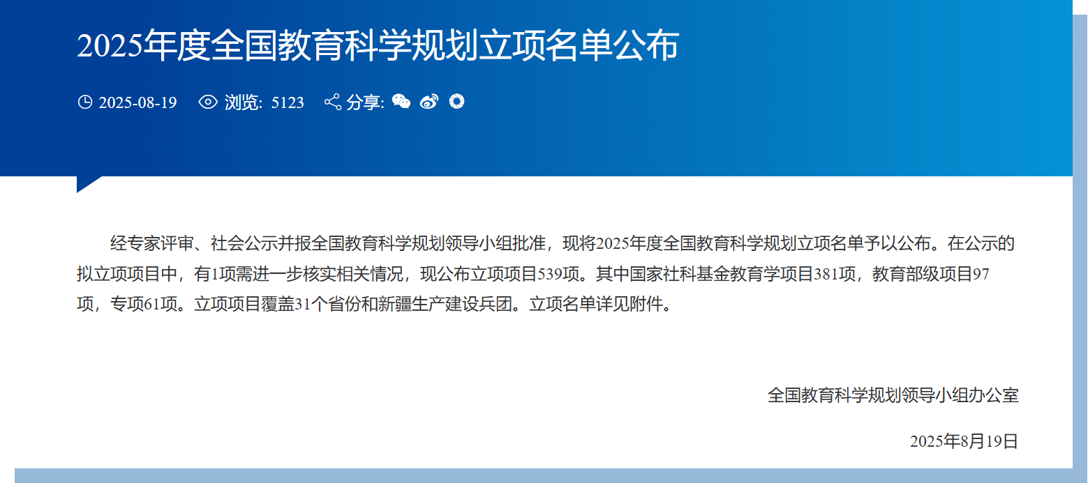 全国教育科学规划课题是我国教育学领域水平最高、权威性最强、影响力最广的学术研究项目。 该课题立项为我校时隔九年再次获批该类别国家级项目,标志着我校在教育科学领域的研究实力取得新突破对促进教育互涉学科建设、提升学术影响力具有重要意义。