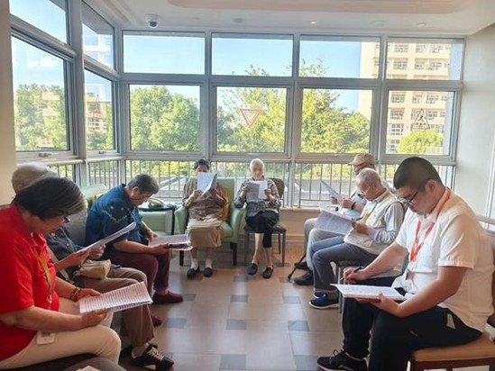 109日,蒋科尔(右一)带领老人们开展读书会活动。受访图者供