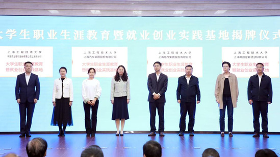 企业代表与学院代表为大学生职业生涯教育暨就业创业实践基地揭牌。