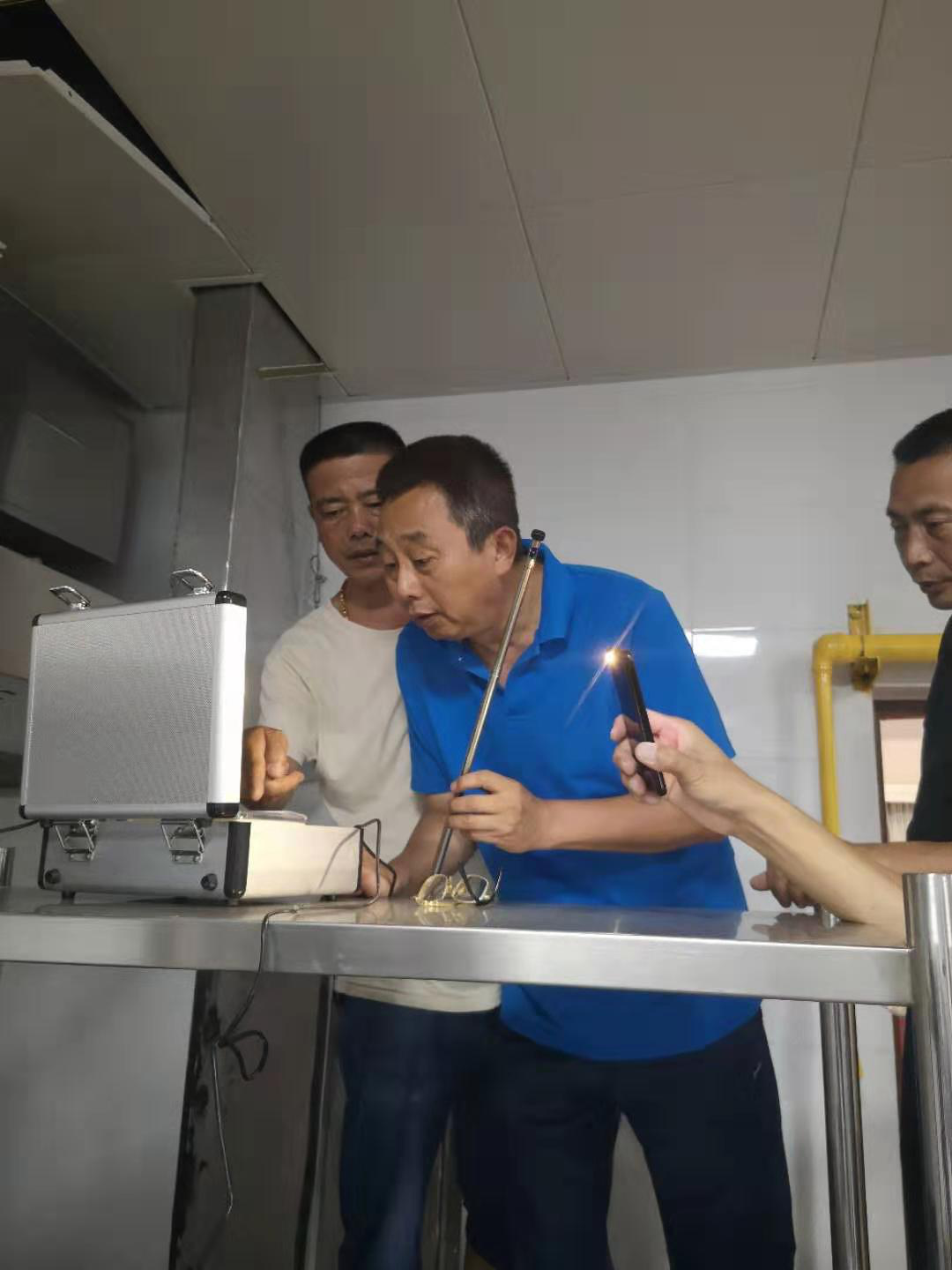 姚秀平副校长十分关心新食堂新学期启用的相关准备工作情况,在听取后勤、基建工作汇报后,与代建单位、总包单位、设备安装单位等进行了技术沟通,亲自设计测试方案。为解决设备安装当中存在的技术问题,在食堂一层的后厨,姚秀平副校长亲自爬上高梯,利用风速仪测试风道速度;率技术人员登上食堂顶层对风机进行测试,通过风道测速,风机测试等工作检查、测试后厨区排风系统功能存在的问题,指导技术人员进行数据记录、计算,最终设计方案达到预期测试目标,找出问题症结,为新学期第二食堂顺利营业打下了坚实的基础。