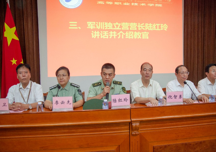 入营仪式上,军训独立营营长陆红玲讲话并介绍教官。来自2018级机电一体化技术专业李逸辉作为参训学生代表发言,表达了全体学生将团结友爱、勤奋学习、不怕苦不怕累,一切听从指挥,以良好的精神风貌和优异的军训成绩向领导和老师汇报。