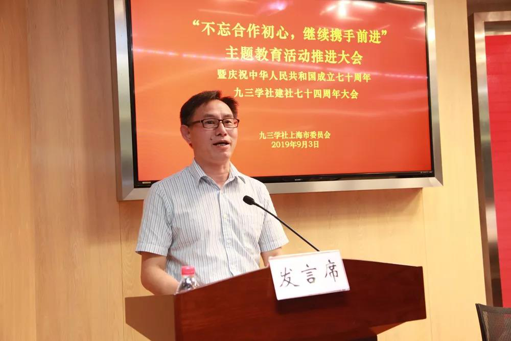 2019年9月3日,九三学社上海市委召开“不忘合作初心,继续携手前进”主题教育推进大会暨庆祝中华人民共和国成立七十周年、九三学社建社七十四周年大会。九三学社中央副主席、上海市政协副主席、社市委主委赵雯结合履职经历作专题报告。市委副主委钱锋主持会议。九三学社工程大委员会主委徐滕岗参加会议。