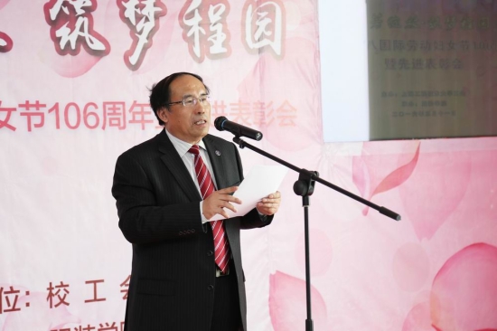 校党委书记李江以“祝贺、分享、共商”为题发表讲话。他向受表彰的先进个人和家庭表示热烈的祝贺,并向出席会议的女性代表以及全校广大女教职工致以节日问候和美好祝愿,期望广大妇女同胞继续投身学校“十三五”,建功立业。李江书记对学校未来妇女工作提出四点希望:第一成绩鼓舞人心,未来催人奋进;第二党政群妇共建,带红“半边天”;第三贯彻群团精神,做好“娘家人”;第四巾帼亦有须眉志,妇女就是半边天。