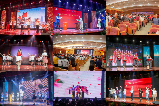 展演活动在师生管乐队催人奋进的《走向复兴》和娓娓动听的《我和我的祖国》乐曲声中拉开序幕。气势磅礴的配乐诗朗诵《七律长征》、《祖国颂歌》,基础教学部的青年老师们精心编排的委婉柔美舞蹈《芳华》令人难忘,亲切感人的手语伴舞《奉献》、耳熟能详的歌曲联唱《大中国今天是你的生日》、透着青春气息的同学们的男声小组唱《我爱你中国》,诙谐的舞台剧《改革春风吹满地》和风趣幽默的小品《垃圾分类新时尚》、相声《啊祖国》以及退伍军人刚劲有力的表演唱《强军战歌》等,一个个节目都精彩纷呈,师生们在舞台上个个光彩照人,以饱满的热情送上了精彩的节目,博得了在场师生们的阵阵掌声与欢呼声,学院校合唱队的大合唱《红旗飘飘》将庆祝活动的气氛推向了高潮,尽情展示了老师们对祖国热爱的情怀。汇演活动结束,伴随着优美的旋律,全体师生手舞国旗全场师生们一起高歌《歌唱祖国》:“五星红旗迎风飘扬,胜利歌声多么响亮;歌唱我们亲爱的祖国,从今走向繁荣富强”,汇演活动在热烈的欢庆歌声中落下帷幕,学院校领导走上舞台和全体演职人员亲切握手合影留念。