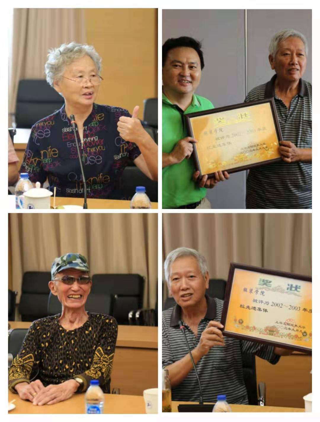座谈会第二个环节,院工会主席王黎明老师提议在场也有部分青年教师,请“回娘家”团聚的退休老同志和青年教师畅谈,忆往昔畅叙各自是如何青春无悔,共享学校建设发展成果。同时又是在“牢记初心使命、推进自我革命”的新征程上,畅谈各自所积累的在教学、管理、科研、育人方面积累的宝贵经验,为青年教师做好引路人,发挥退休老同志经验优势,弘扬正能量。交流伊始,张海成老师就向学院赠送了一份珍贵礼物,是他所珍藏的“服装学院被评为2002-2003年度校先进集体”荣誉奖状,这份礼物既饱含了服装学院老一辈教育工作者的奋斗历程,同时也蕴含了对优良传统的传承践行不忘初心。随后院退休老师孙熊老师,黄勤奋老师、曹丽娜老师、陈莹老师、张国强老师、阮仪老师和荣德芳老师都踊跃做了交流发言。最后年逾九旬的张国强老师精神抖擞、兴致高扬,带领在座的各位退休老师共同唱响了一曲《我和我的祖国》,献上了老教师们对我们国家七十年华诞深深的祝福,祝愿伟大祖国繁荣富强,同时也祝愿工程大的教育事业蒸蒸日上。