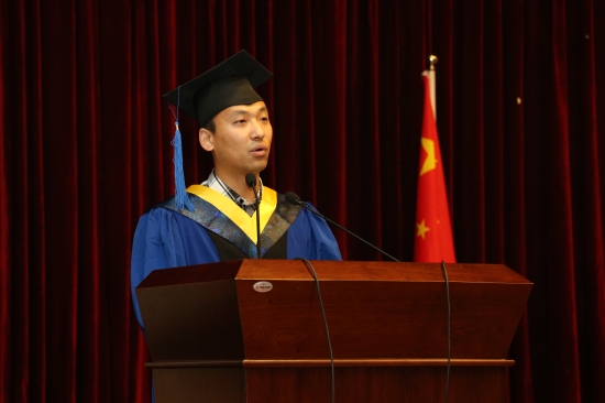 研究生国家奖学金、市优秀毕业生称号获得者、化学化工学院的张炜同学以《青春无悔感恩母校》为题,代表全体毕业研究生发言,他回忆了在母校学习、生活和成长的点滴,讲述了自己的奋斗历程和取得的成绩,他对母校的悉心培育、老师们的谆谆教诲、亲人的默默支持表示由衷的感谢,并表示在今后的人生道路上,迎着阳光,趁着风,勇敢地飞向心中的梦想,为母校增光添彩。