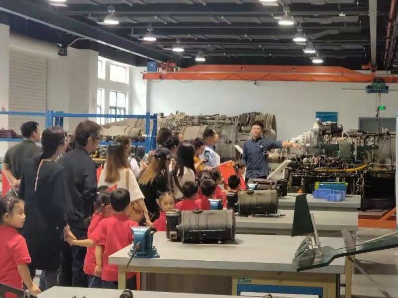 在完成客舱部分的科普和体验之后,他们来到了航空发动机实验室。在这里,志愿者回答了小朋友们对发动机引擎的问题。同时志愿者也向小朋友提出了几个问题,得到了各种奇思妙想的回复,场面生动活泼、互动热烈。最后,志愿者向小朋友及其家长介绍了战斗机发动机、运输机发动机、轰炸机发动机和民航客机发动机,以及这几类发动机各自的特点和差别。幼儿园的学生及其家长饶有兴致地听取航空知识讲解,深感不虚此行,也对志愿者们周到细致的服务深表感谢。