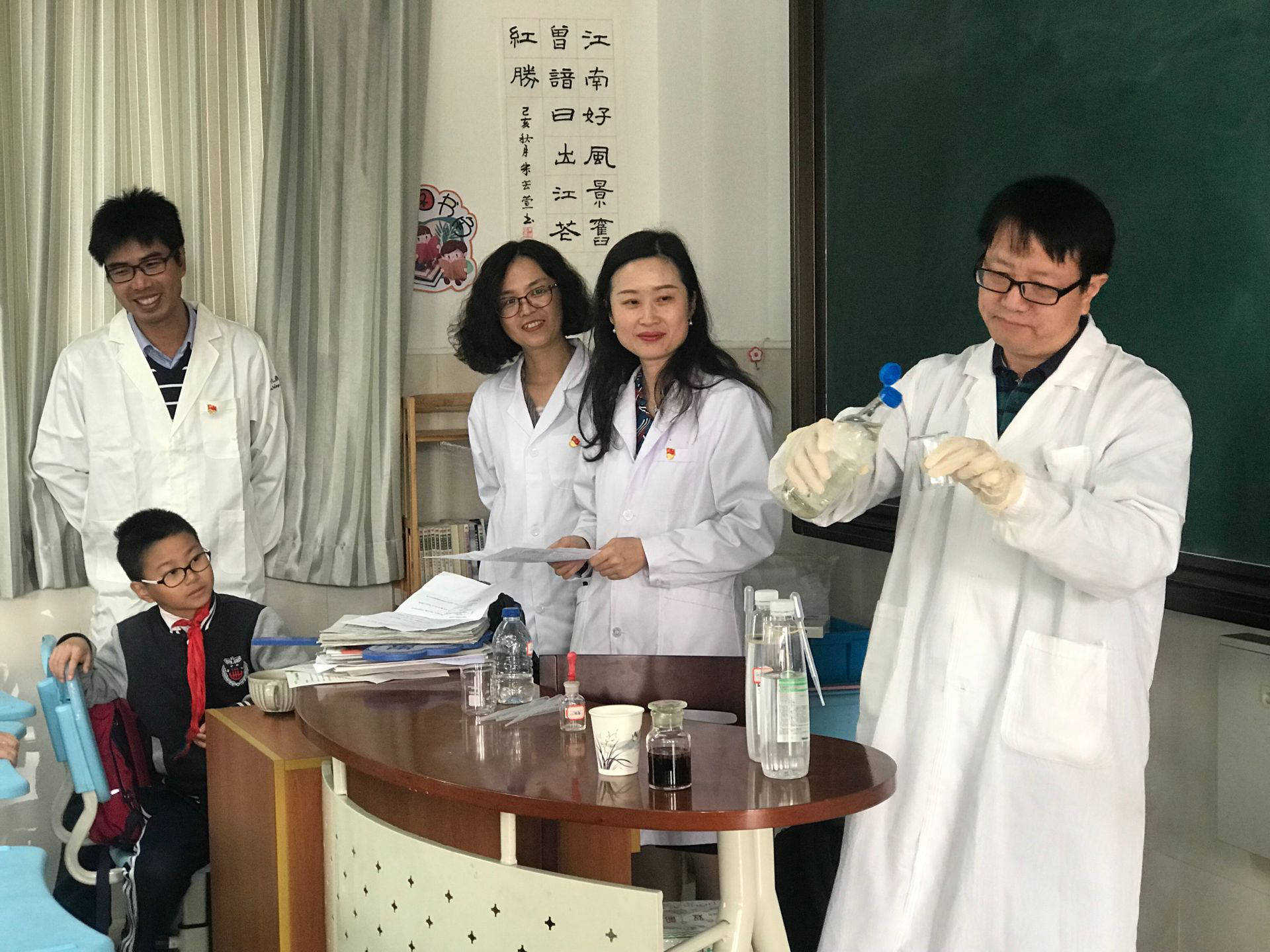 深入贯彻落实“不忘初心、牢记使命”主题教育为人民群众办实事、办好事要求,10月28日下午,化学化工学院党委制药工程专业教工党支部进入东华附属实验学校课堂,开展主题为“化学与生活”的科普志愿服务活动。通过故事讲述导入化学基本概念,通过案例分析神奇现象的化学原理,通过生活中化学品(筛选安全无害,优选食品级)进行实验演示,有效激发了少先队员们对化学的兴趣,培养其科学素养。
