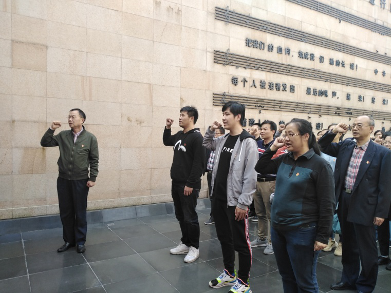 参观完纪念馆后,在“重温入党誓词”宣誓广场举行了“10月份入党党员政治生日”仪式。在工程实训中心党总支书记曹开云同志的带领下,全体党员面向党旗庄严宣誓。宣誓结束后,工程实训中心党总支书记曹开云同志向金工党支部的刘圣敏同志,电工党支部的张静之同志和东华大学工程实训中心党支部的孙琪同志赠送了党员政治生日贺卡。