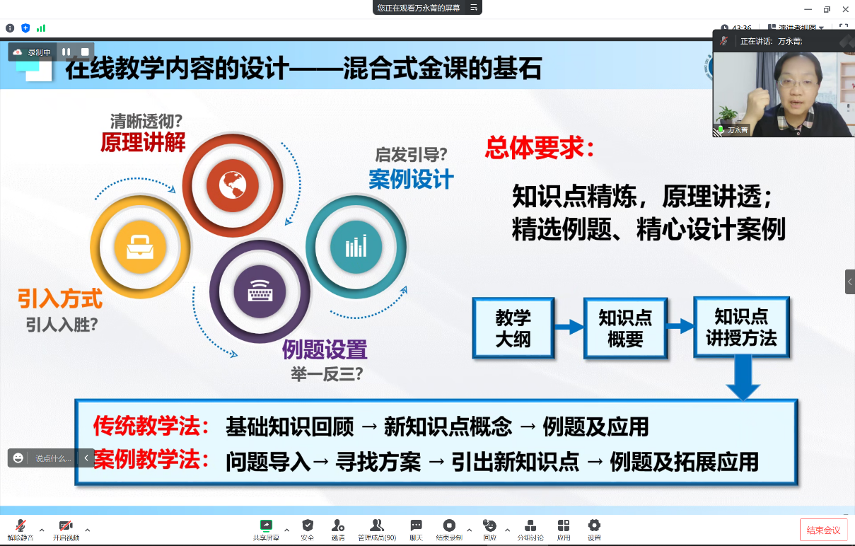 培训会上,万永菁教授从“如何建设混合式课程”“关于课程思政的思考”“课程建设的体会与分享”“课程建设材料撰写要点”四个方面分享了开展混合式教学实践和研究以来的宝贵经验和做法。万老师以自己主讲的国家级线上线下混合式一流课程《数字信号处理》为例,用通俗易懂的语言深入浅出地向老师们分享了混合式教学的实践过程及课程思政的教学设计方法和设计过程,对实施线上线下混合式课程教学,包括设计在线视频、精选在线练习、互动翻转课堂和实践巩固提升等,每一个环节的具体做法进行重点讲解。