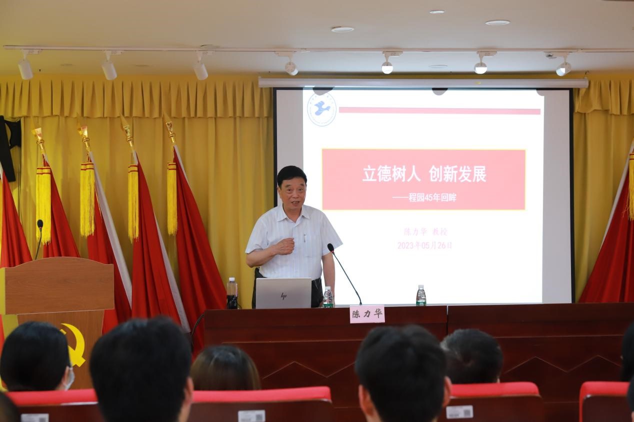 本次读书班邀请校关工委副主任、校老教授协会副会长陈力华教授以《立德树人 创新发展——程园45周年回眸》为题作专题报告。陈力华教授满怀着前辈工程大人爱校容校的深厚情感,用详实的内容、生动的案例、精彩的讲述,为我们呈现了程园45年来的发展脉络,让读书班的师生能够在校史、校训、价值取向中汲取奋进的力量,共同为建设国内一流的高水平现代化工程应用型特色大学贡献自己的力量!