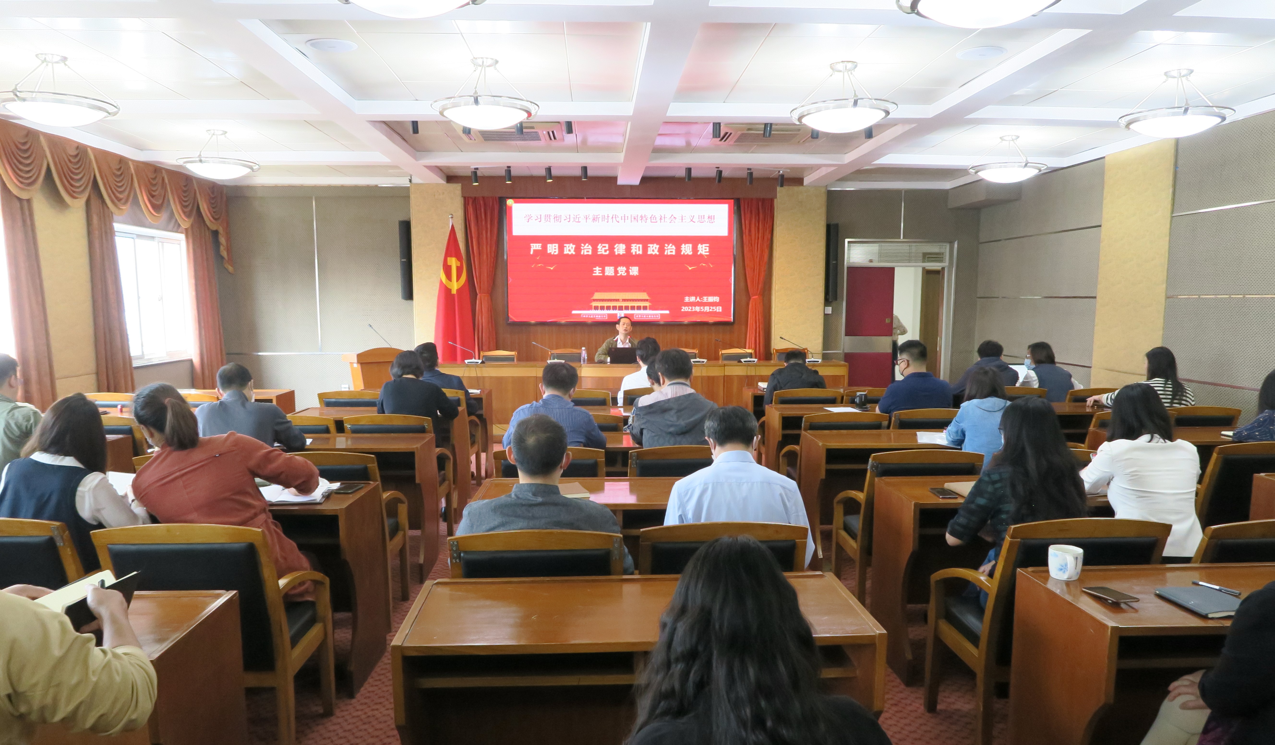 党课围绕习近平总书记的重要讲话精神和上级党委部署要求,从主题教育的总要求和根本任务出发,结合学院校实际,围绕“中国共产党严明党的政治纪律的理论依据”“中国共产党严明党的政治纪律的百年历程”“中国共产党严明党的政治纪律的时代要求”三个方面的内容进行了重点阐述。王振钧书记勉励全体干部同志,要讲政治、明大局、守底线,立德正身,要以党章为规矩、以党章为镜鉴,以坚强党性作为立身、立业、立言、立德的基石。要继承与发扬党的成功经验和优良传统,领悟党的方针,坚定党的信念,拓宽视野、更好地指引未来。要不断补足精神之钙、坚定政治信念,抬高认识站位、强化政治自觉,锤炼党性修养、培塑政治品格,常怀戒备之心、守牢政治红线,在严明政治纪律上立起更高标准,以实际行动诠释对党绝对忠诚。