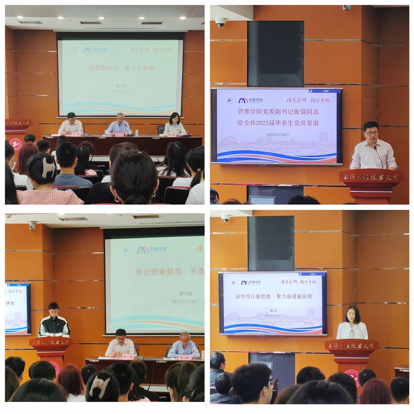 唐书清作为2023届研究生党员代表做了“牢记使命担当,不负青春梦想”的发言,他强调了牢记使命担当和不负青春梦想的重要性,鼓励同学们在今后的工作和生活中时刻保持对党的忠诚和为人民服务的初心。魏南作为2023届本科生党员代表做了“深学笃行新思想,聚力奋进新征程”的发言。她跟所有毕业生党员分享了读大学的感悟:多行动少迷茫;不要和别人比较;要学会感恩。她鼓励同学们要不断学习新知识,坚定信仰,并勇于面对挑战,为实现个人的理想和国家的发展贡献自己的力量。