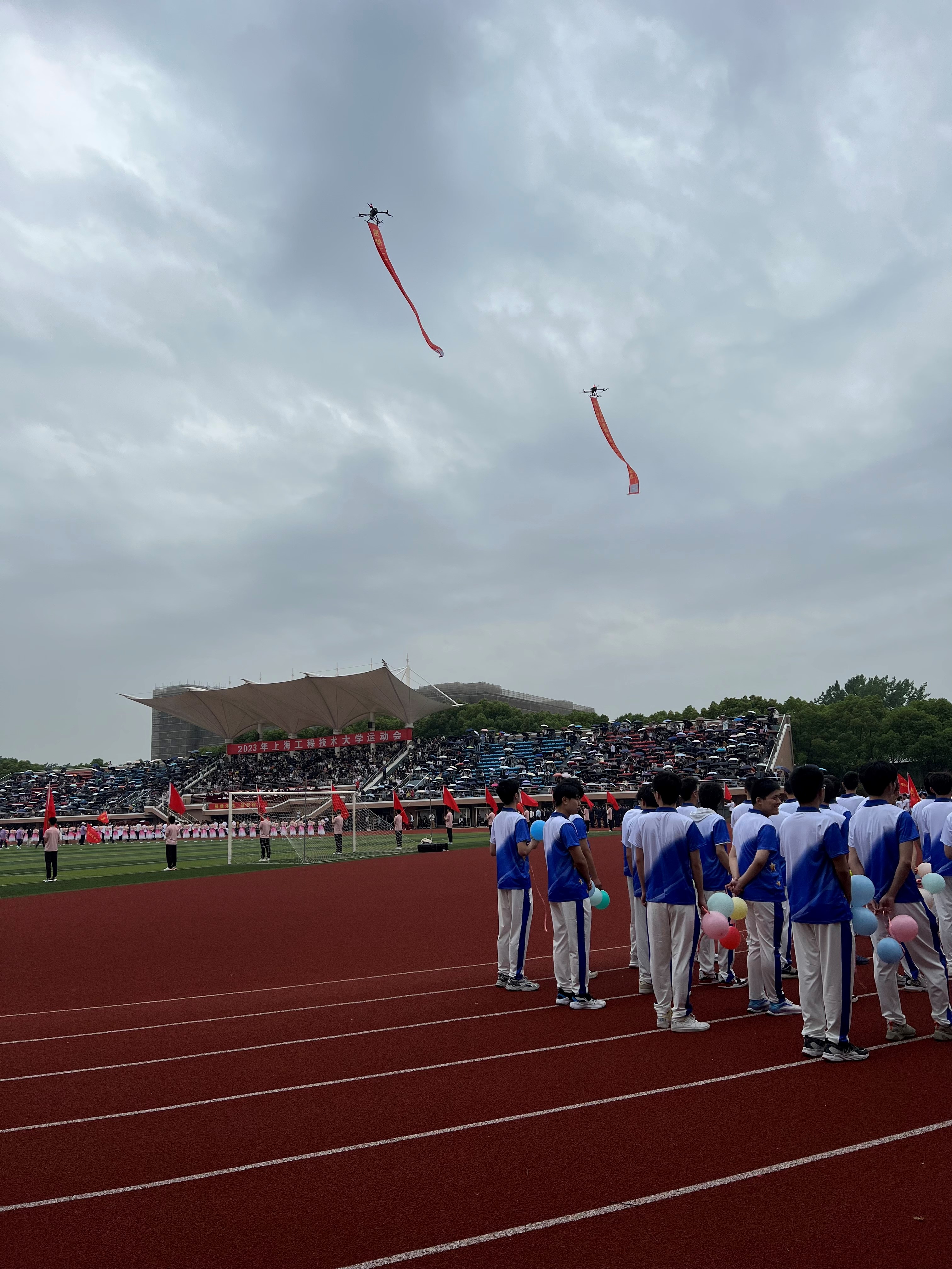 合作团队用M300无人机搭配成抛投器将两条祝福横幅挂在无人机上。无人机在空中飞行,通过抛投器将横幅展示给全场师生,赢得了现场师生的阵阵掌声和赞叹。表演不仅为运动会增添了亮点,也展示了上海工程技术大学教师和学生对科技创新的热情和追求。通过观看表演,大家对无人机技术有了更深入的了解和认识,也激发了大家对航空航天事业的向往和信心。