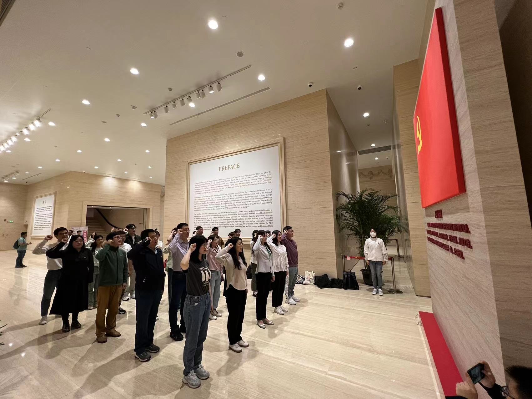 中共一大纪念馆是共产党人的精神家园,是令人心驰神往的殿堂。上海市委讲师团专家、马克思主义学院副院长于凯教授带领党员开展寻访学习,参观“前仆后继、救亡图存”“民众觉醒、主义抉择”“早期组织、火星初燃”“开天辟地、日出东方”“砥砺前行、光辉历程”主题展,深刻领略中国共产党历经艰难险阻、峥嵘岁月的矢志不渝,切实体会一代代共产党人的豪情壮志和生生不息的坚毅品格!纪念馆宣誓厅悬挂着巨幅中国共产党党旗,面对党旗,马克思主义学院党总支书记董旖旎带领全体寻访学习的党员重温入党誓词,激励大家牢记使命,奋勇前行!