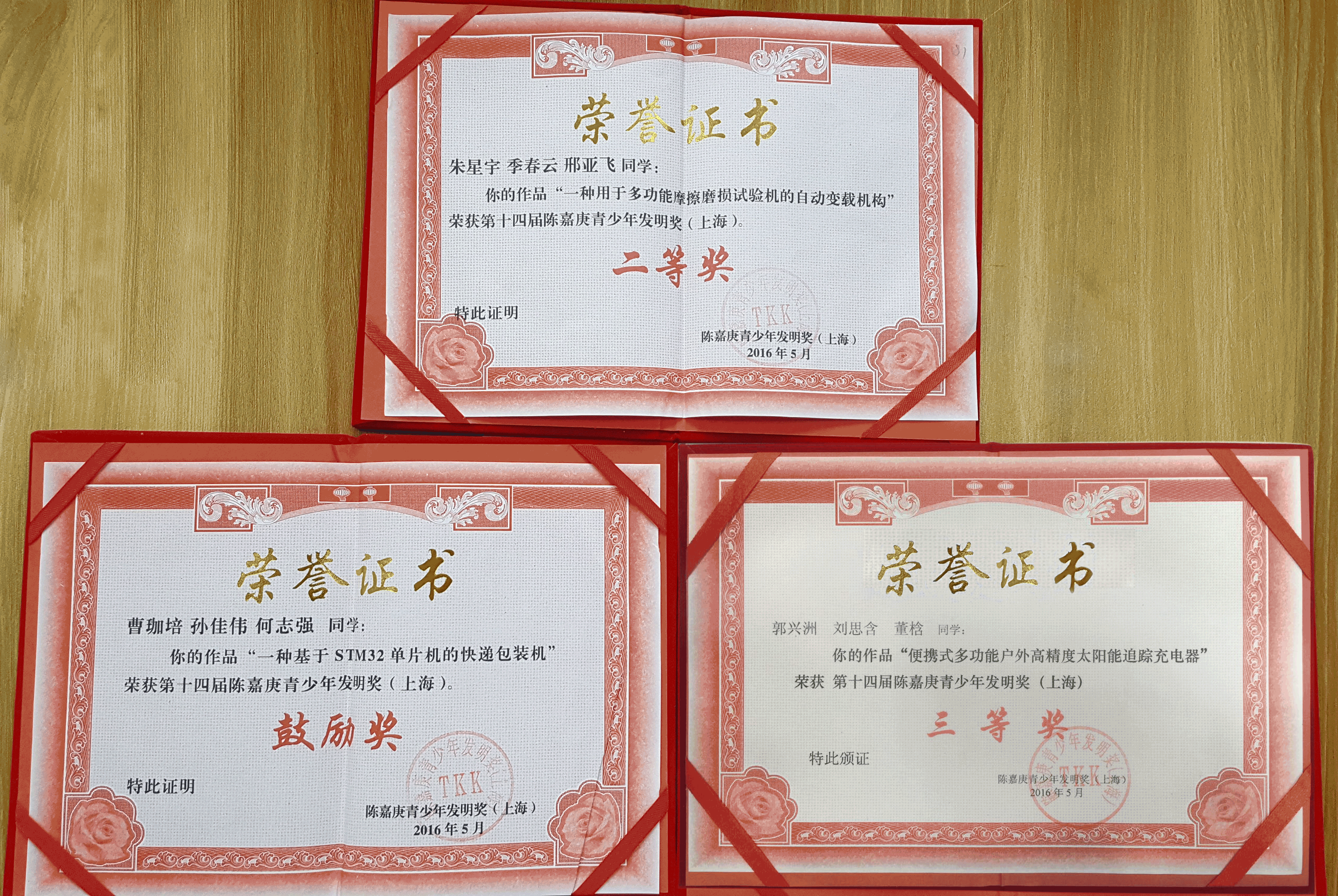 第十四届陈嘉庚青少年发明奖(上海)评选中,机械工程学院朱星宇团队的“一种用于多功能摩擦磨损试验机的自动变载机构”项目荣获二等奖,汽车工程学院郭兴洲团队的“户外便携式多功能高精度太阳能追踪充电器”项目荣获三等奖,汽车工程学院曹珈培团队“一种基于STM32单片机的快递包装机”项目荣获鼓励奖。
