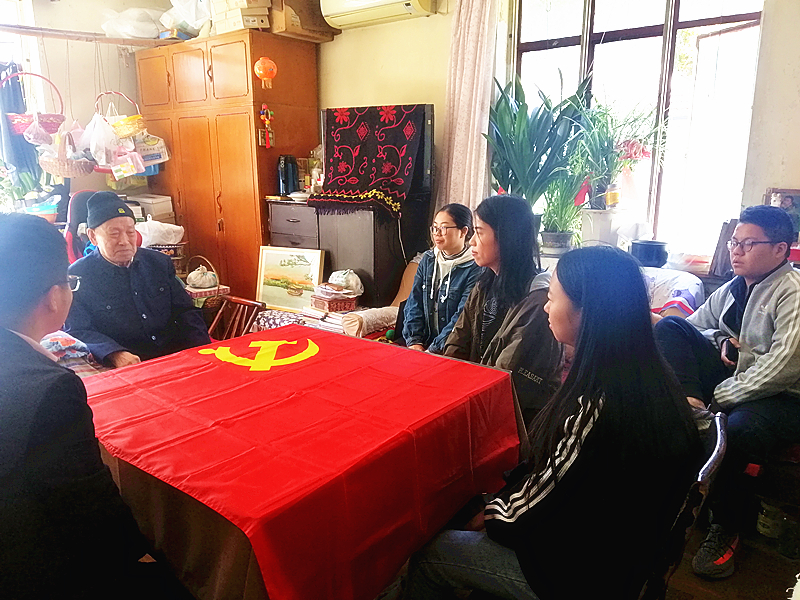 阮老已有95岁高龄,但精神矍铄带我们拾级而上三层小楼,热情欢迎我们到他家里就坐。阮老家不过一张双人床的单间,屋子里勉强放的下一张老式木桌,柜子里桌子上杂乱摆放着生活用品和各类药品。同学们就在桌子旁围坐下来聆听老同志讲述初心与使命。