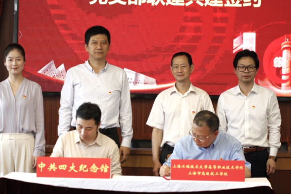 为不断提高基层党组织的创造力、凝聚力和战斗力,努力形成共同发展的基层党建工作新格局,中共四大纪念馆副馆长吴毅斌与高职学院、高技校政工党支部书记、学生科科长徐伟文进行党支部联建共建签约。