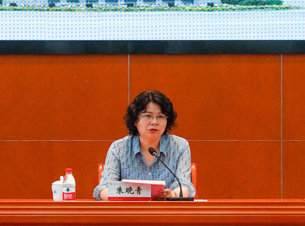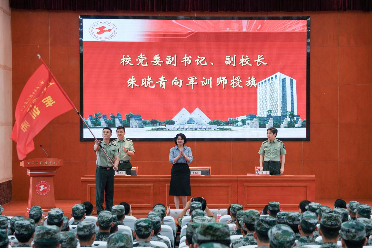 校党委副书记、副校长朱晓青代表学校向军训师授旗并讲话。她首先向全体承训教官表达了崇高的敬意和衷心的感谢,她强调,军训是国防教育的重要组成部分,学校高度重视军训工作,将军事训练和理想信念培育相结合,丰富军训内容,拓展军训形式,挖掘军训内涵,科学训练、合理训练,让军事训练这堂大学必修课有血、有肉、有灵魂。她向参训学生提出了三点希望:一是要进一步坚定理想信念,厚植爱国情怀,把军训作为激发爱国热情、塑造优良道德情操、培养坚定意志品质的难得机会;二是要传承军旅精神,锤炼意志品质,发挥吃苦耐劳的革命精神,用严格的纪律约束自己,锤炼自身;三是要学习军事技能,增强国防素养。不仅要接受国防教育,还要学习安全教育,加强“人防”与“国防”教育的融合,不断提高当代大学生军事技能水平、国防战备观念、爱国爱军情怀以及国防军事素养。