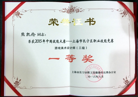 2015中国技能大赛上海市长宁区职业技能竞赛表彰及新一轮职业技能竞赛启动大会于近日在长宁区工人文化宫盛典召开。我校中韩多媒体设计学院学生熊凯伦荣获三级游戏美术设计师一等奖。