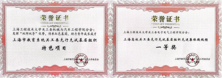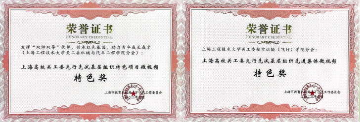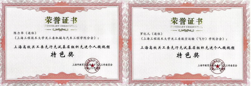 机械与汽车工程学院分会的项目《发挥“双师双导”优势,传承红色基因,助力青年成长成才》获得“上海市教育系统关工委先行先试基层组织特色项目”;电子电气工程学院分会荣获“上海高校关工委先行先试基层组织先进集体微视频一等奖”;机械与汽车工程学院分会、航空运输(飞行)学院分会获得“上海市教育系统关工委先行先试基层组织特色项目微视频特色奖”。