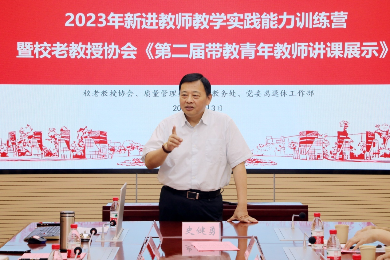 为进一步提高我校青年教师“课程思政示范课”的综合水平,助力学校造就一支高素质专业化青年教师队伍,7月3日,2023年新进教师教学实践能力训练营暨上海工程技术大学老教授协会第二届带教青年教师讲课展示在松江校区行政楼406会议室举行。校党委副书记史健勇,老教协会长夏斯云,副会长陈力华,副会长程维明,质量管理办公室(教师教学发展中心)主任匡江红,教务处副处长金晓怡和党委离退休工作部相关同志,全体青年教师导师团及青年教师代表参加会议。本次会议由陈力华副会长主持。