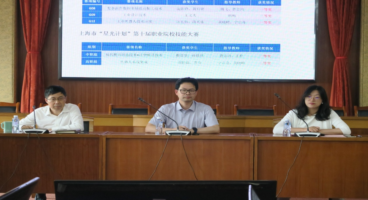 教务科科长卞伟华回顾了学院校在2022年全国职业院校技能大赛中取得的优异成绩,介绍了2023年全国职业院校技能大赛的赛制变化及学院校组织参赛的情况。机电工程系主任张蕊、制造工程系副主任周立波、现代模具制造技术赛项教练王浩、机器人系统集成应用技术赛项选手黄陆磊作了交流发言。