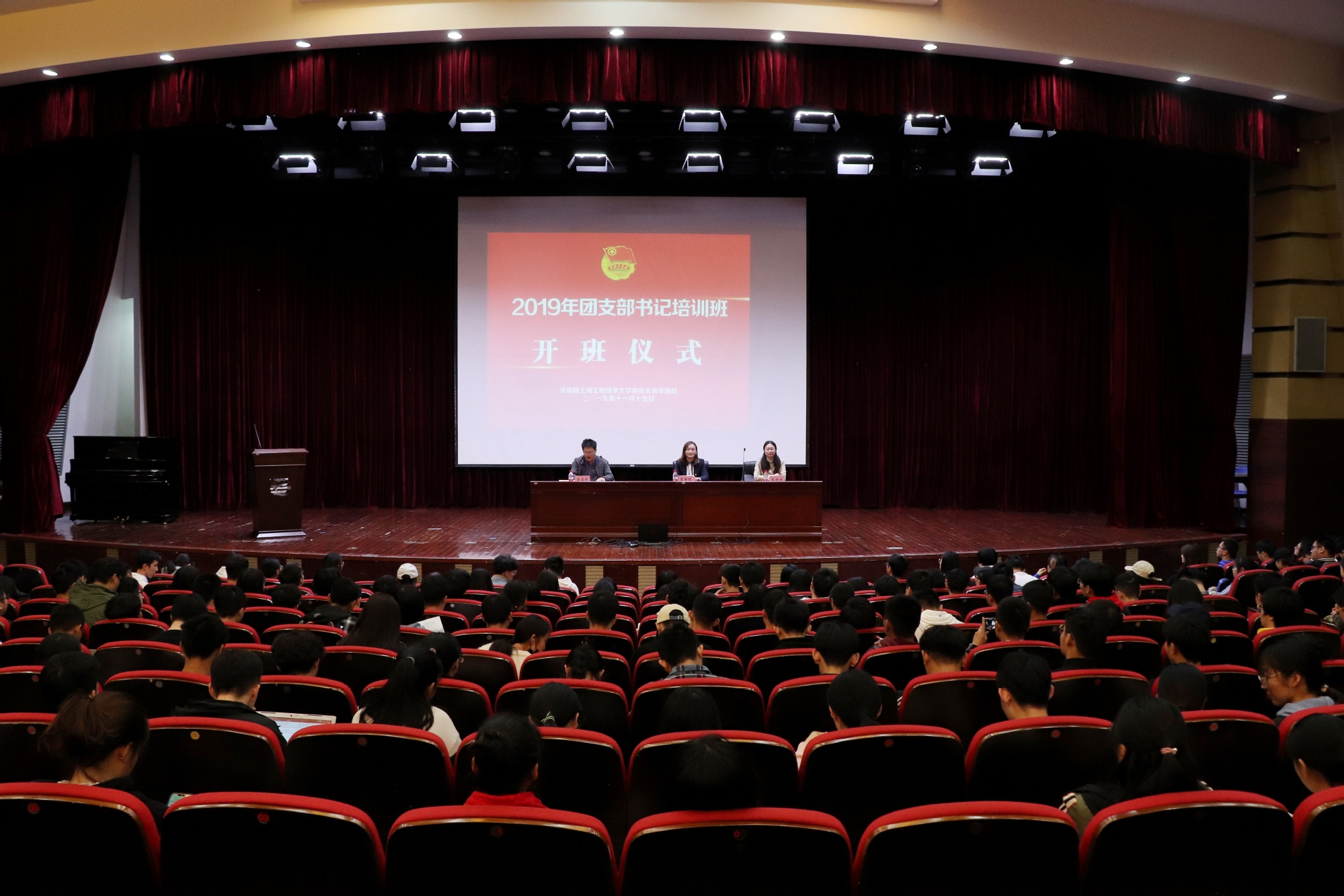 11月15日下午,校团委在图文信息中心志宏堂举行2019年团支部书记培训班”开班仪式。校团委书记董旖旎老师,团市委组织部赵丹丹老师,全校二级学院团委副书记、组织部长以及全校团支部书记400余名同学参加了仪式,仪式由校团委副书记陈翼然老师主持。