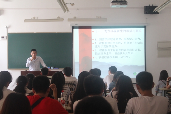 学院12个专业的资深老师们及院系专任教师来到教室与新生们见面,并就专业方向、学习要求、就业前景等同学们最关心的内容进行了具体介绍,要求同学们尽快熟悉本专业,通过课程学习、课外钻研和社会实践,对专业有更深的理解。此外,学院邀请高顿财经申晓明专员为相关专业安排企业导师,向新生们介绍了目前专业对接企业的一些需求,专业实际应用方面的最新成果。鼓励同学们打好专业基础,积极参与相关企业实践,在工作中发现差距,提高专业素养。工程管理14届校友陈焕澄也来到了专业介绍现场,作为一名学长向新生提出了专业学习的建议,希望同学们努力学习,全面发展,从而有更多选择的机会。